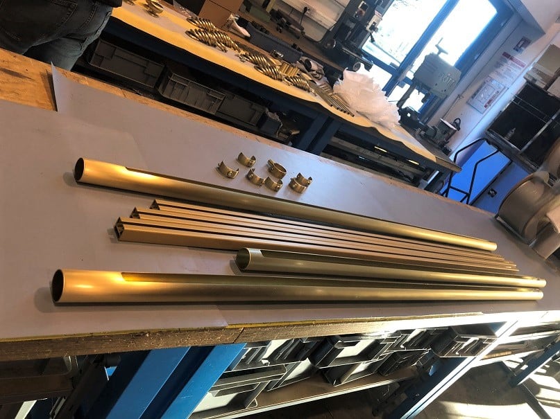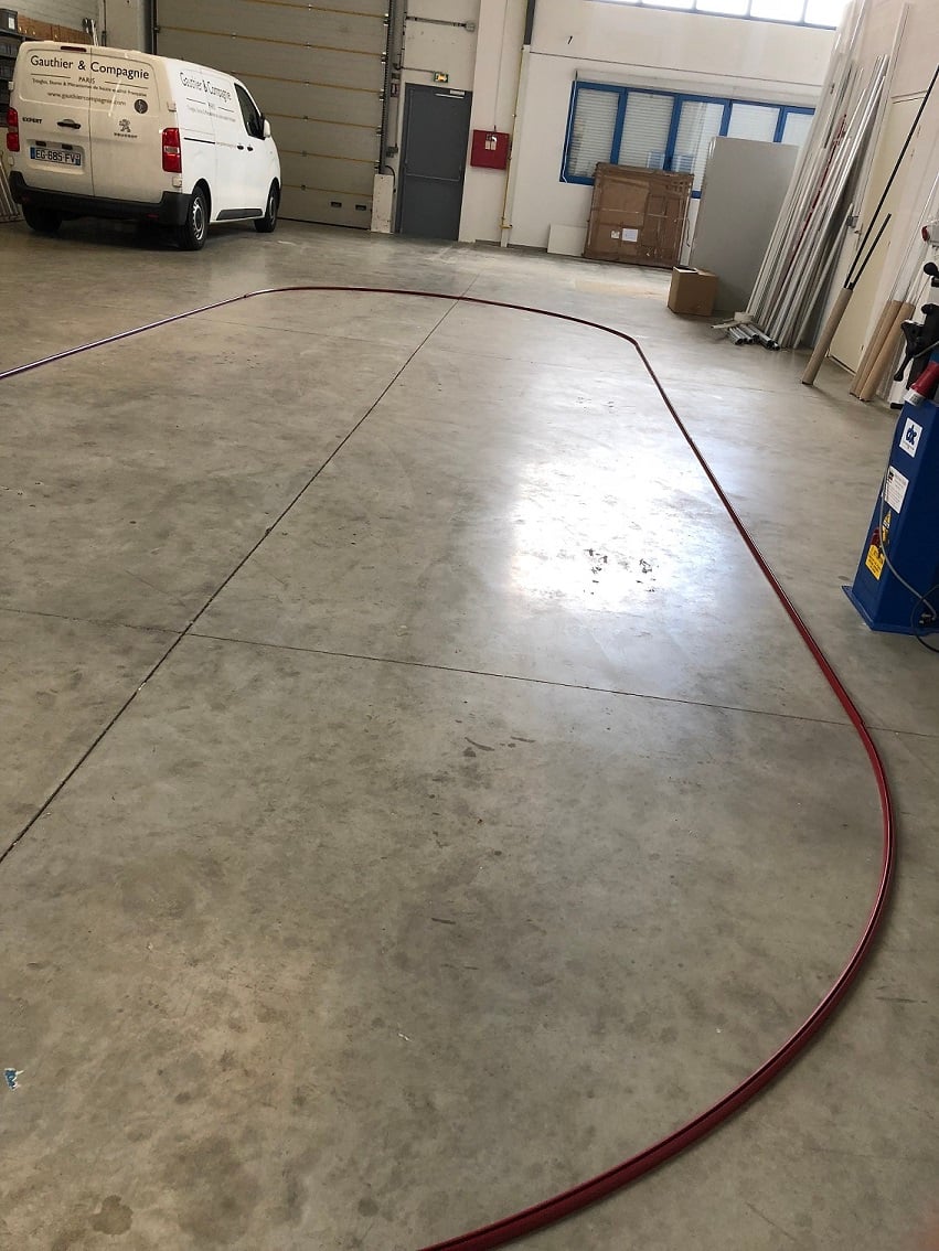 Rail pour stores en ellipse de 25 m de long posé au sol avant le montage dans l’atelier du fabricant français