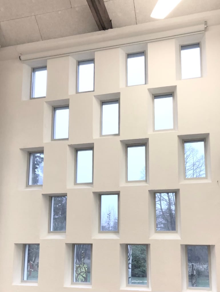 4M x 6M motorized roller blind D80MM & series of 10 Somfy® motorized roller blinds with Mermet 11201 total blackout fabric white flocked back. Art Center La Chapelle.