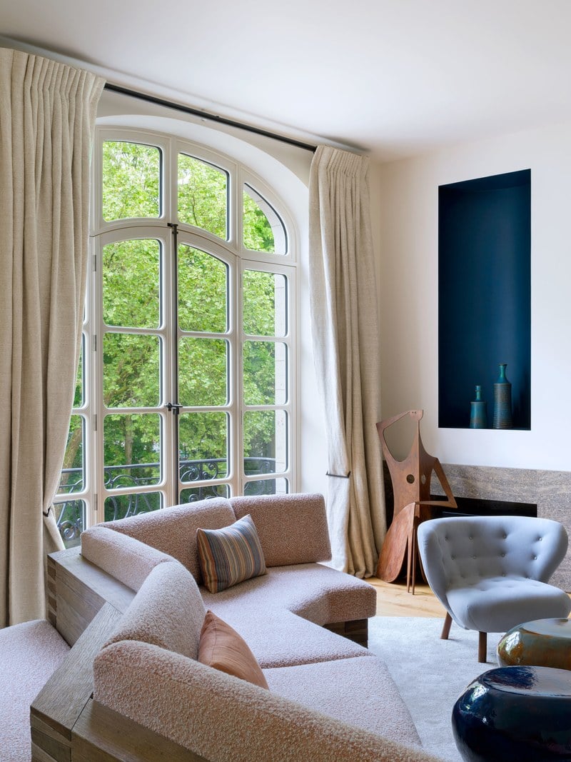 D35MM mat black french poles and decorative motorized curtain rods. Apartment in Brussels, interior design by Pierre Yovanovitch, upholstery by Jouffre. Photo credit: Jjose-Manuel Alorda.