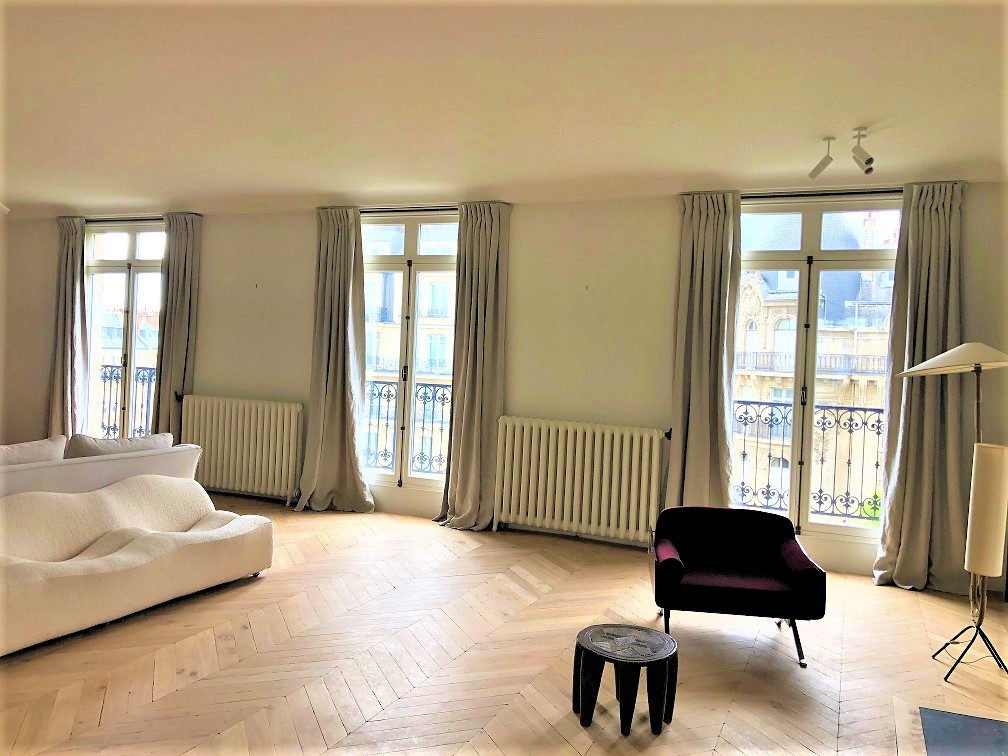 Duplex apartment in Paris : chesnut exoxy D28MM french pole and 2,2M x 4,5 M Silentgliss blind with Somfy® motorization, canva: Serge Ferrari total blackout. Upholsterer: Calamanco – Interior design: Hélène Van Marcke – Architect: Interstice.