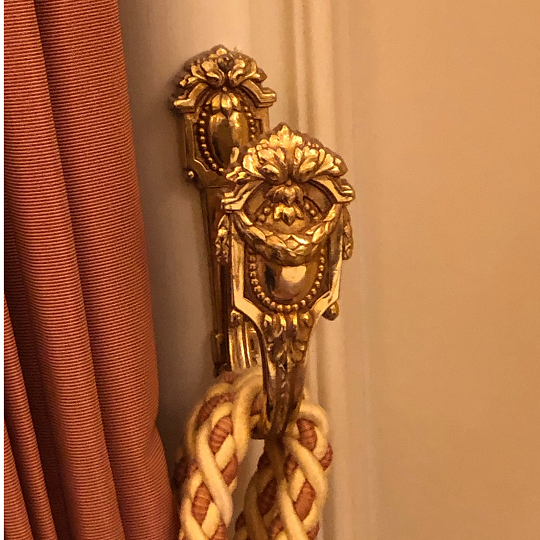 Ritz Paris : Ambiance variations around the Louis XVI style tieback with pearls and ribbons ref. G53003, patinated varnished brass, traditional sand foundry process. Upholsterer: JIP Décor, Paris.