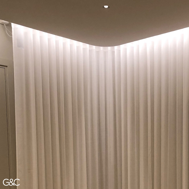 SILENT MOTORIZED TRACKS 38 to 42 dB, Somfy® Glydea ultra 35 RTS. 8 tracks including a 7 m long track, and 3 bended tracks in a reception and meeting room.