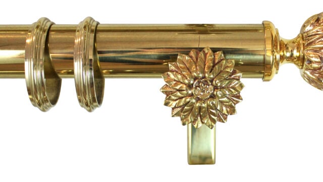 Sélection d’embouts Louis XVI, fonderie laiton massif, procédé traditionnel au sable. Modèles « Pomme de pin » (emblématique du style Louis XVI), « Godron » et « Facettes ». Finition laiton patiné verni. Autres finition : décor électrolytique — bronze médaille, laiton vieilli, canon de fusil,… —, dorure, argenture. Tous les embouts style Louis XV : voir catalogue Tringles p. 87.